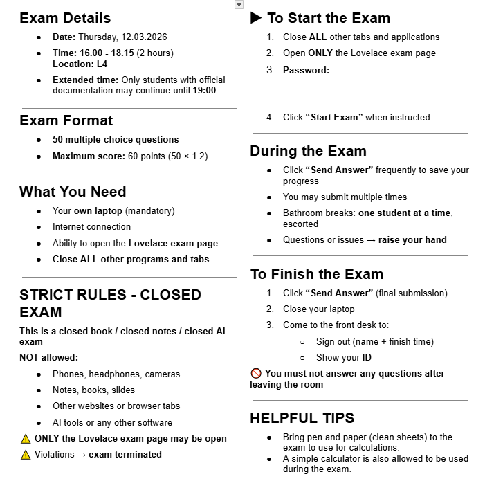 Once the exam started, you can load it by pressing the button Start Exam below. To save your answers, make sure to press the Send Answer button. After that, you can reload the page and press Start Exam as often as you wish without losing your most recent answers.